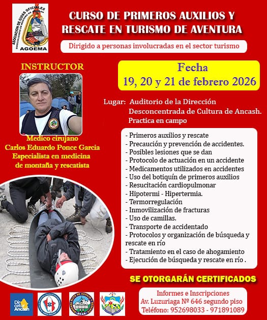 AGOEMA, Asociación de Guías Oficiales Especializados en Montaña de Ancásh, es una Asociación sin fines de lucro capacitados para el guiado técnico profesional en alta montaña, caminata y actividades afines, forma parte de la Federación Nacional de Guías de Turismo del Perú FENAGUITURP, los agremiados cumplen con los estándares de calidad como Guías competitivos, basada en principios de profesionalismo, unión, solidaridad, respeto y concertación.